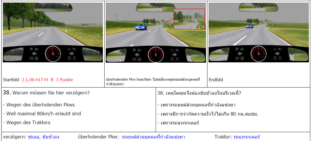 Prüfungsbögen in Farbe zur Vorbereitung auf die Führerscheinprüfung in Deutschland mit allen amtlichen Prüfungsfragen für die Fahrerlaubnis Klasse B in Deutsch und Thai.